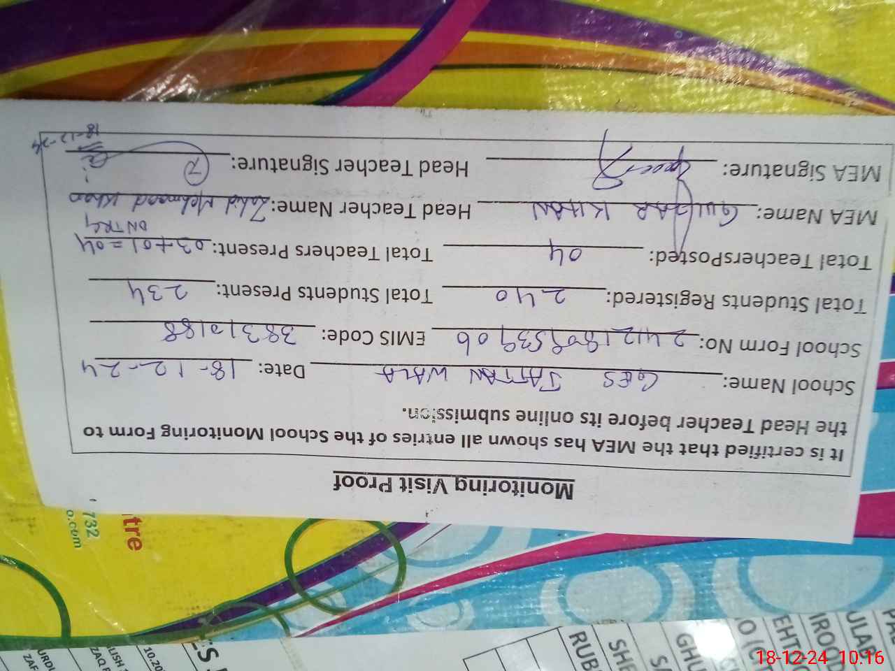 | Attendance Register | Head Teacher | MEA with School | Visit Proof |