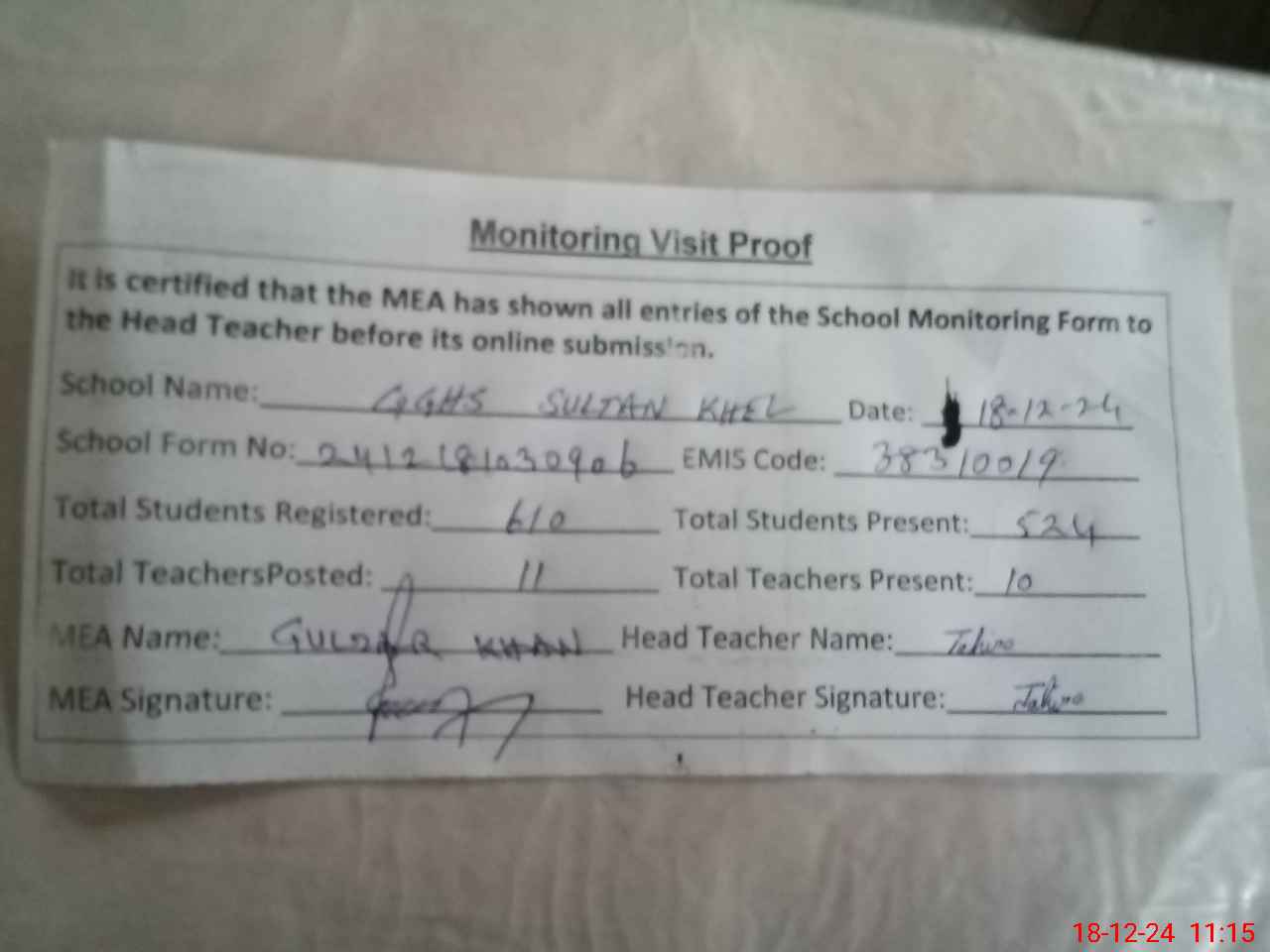 | EMIS Code: 38310019 | Name of School: GGHS SULTAN KHEL | |||