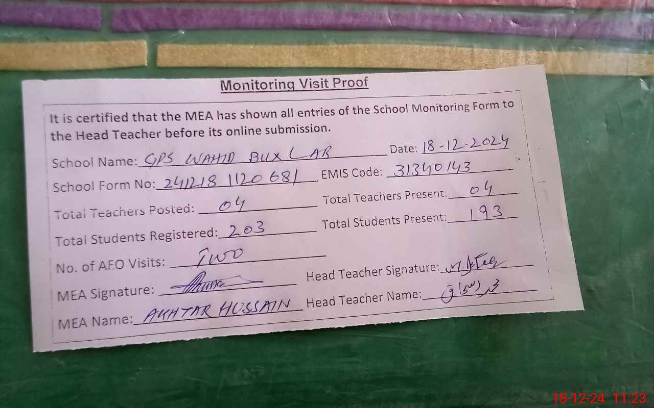| EMIS Code: 31340143 | Name of School: GPS WAHID BUX LAR | |||