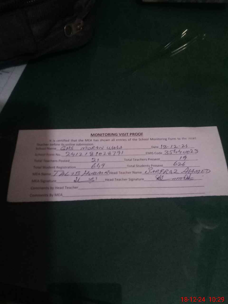 | Certified that this School was Inspected by the Undersigned MEA/DMO Today and the Information Stated Above is as Per Record. | |||||