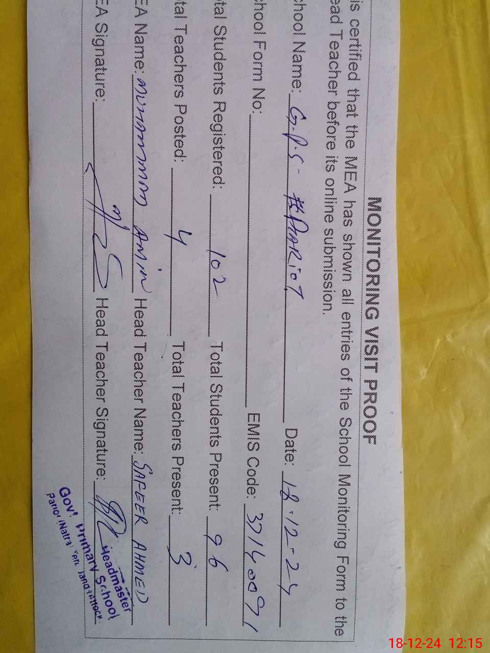| Attendance Register | Head Teacher | MEA with School | Visit Proof |