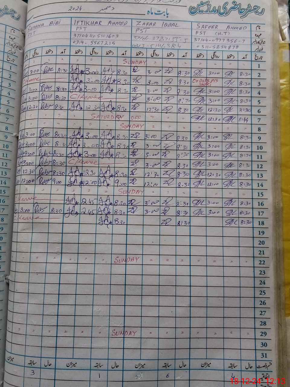 | CNIC | Full Name | Designation | R/C | Absence During Last Calender Month |