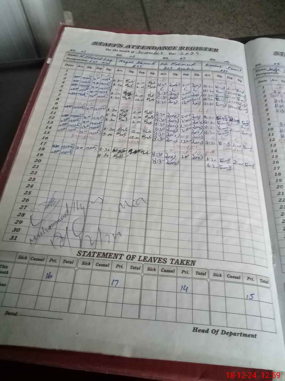 | CNIC | Full Name | Designation | R/C | Absence During Last Calender Month |