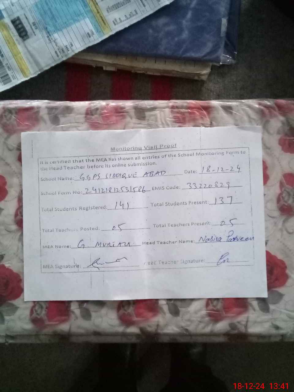 | EMIS Code: 33220829 | Name of School: GGPS SIDDIQUE ABAD | |||