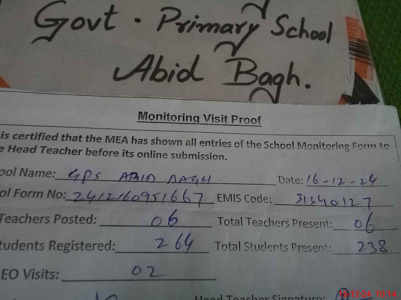 | EMIS Code: 31340127 | Name of School: GPS ABID BAGH | |||
