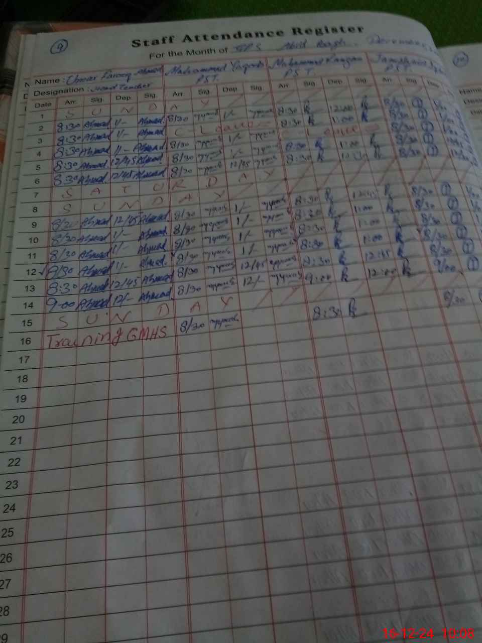 | CNIC | Full Name | Designation | R/C | Absence During Last Calender Month |