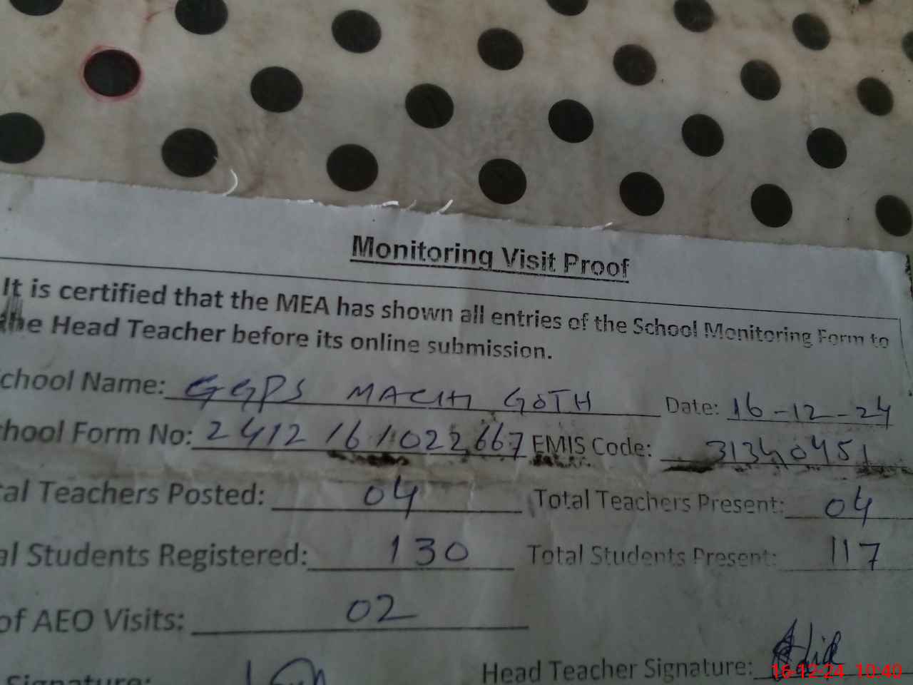 | Attendance Register | Head Teacher | MEA with School | Visit Proof |