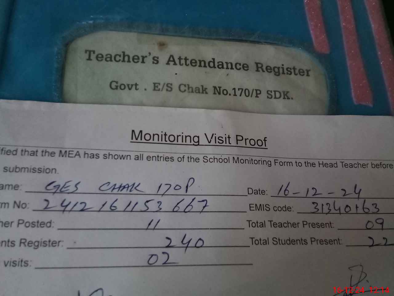 | Attendance Register | Head Teacher | MEA with School | Visit Proof |