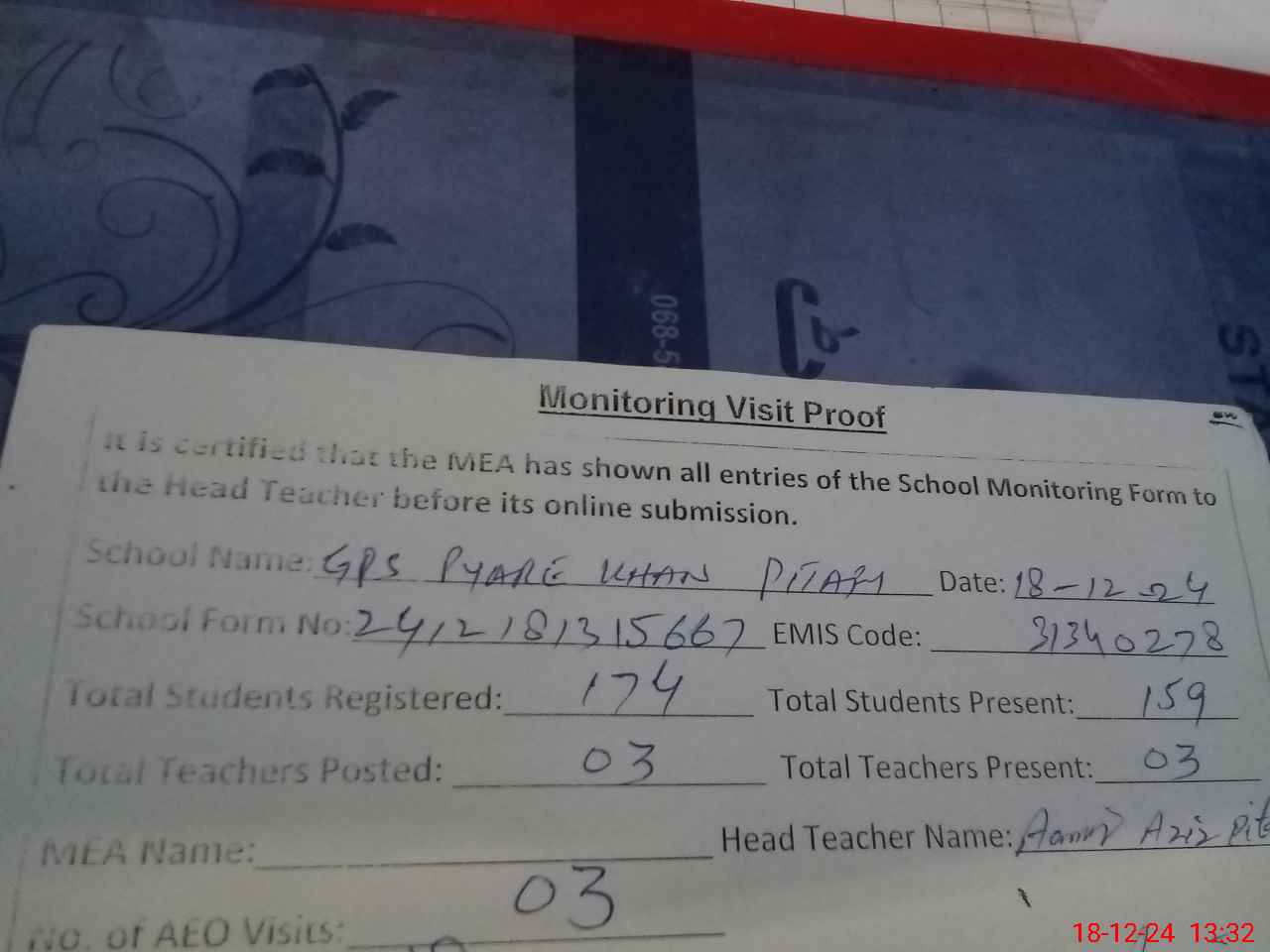 | Attendance Register | Head Teacher | MEA with School | Visit Proof |
