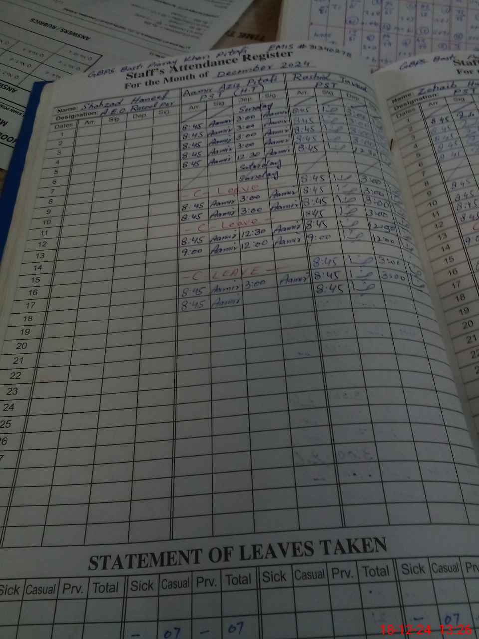 | CNIC | Full Name | Designation | R/C | Absence During Last Calender Month |