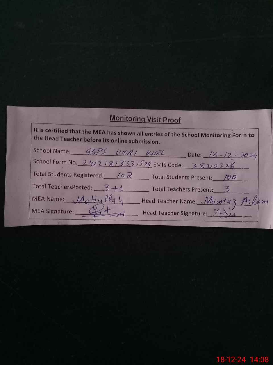 | Attendance Register | Head Teacher | MEA with School | Visit Proof |