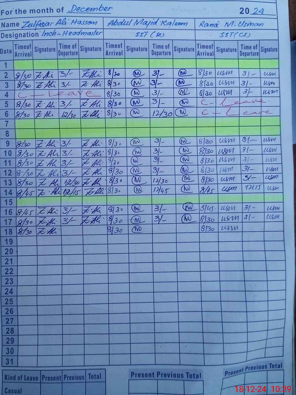 | CNIC | Full Name | Designation | R/C | Absence during last cal. month |