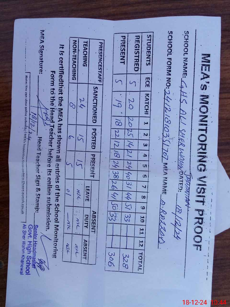 | Attendance Register | Head Teacher | MEA with School | Visit Proof |