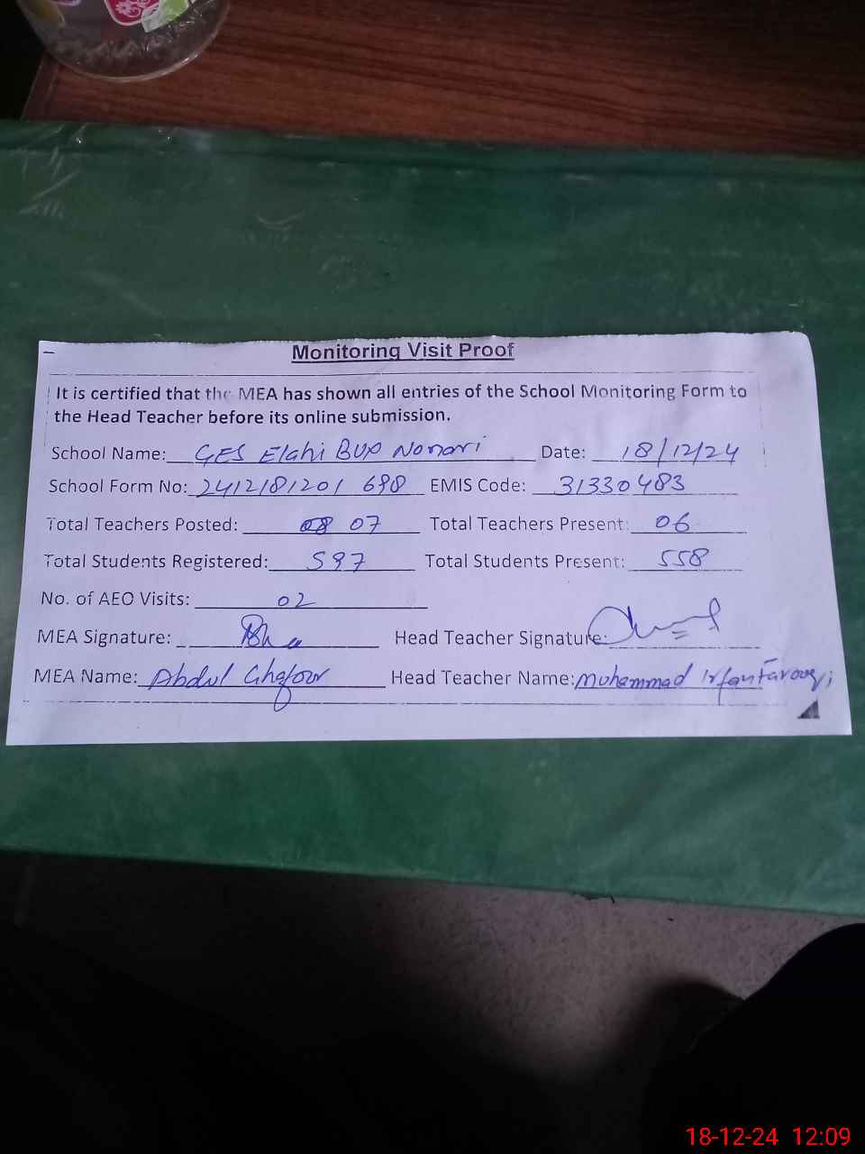 | Attendance Register | Head Teacher | MEA with School | Visit Proof |