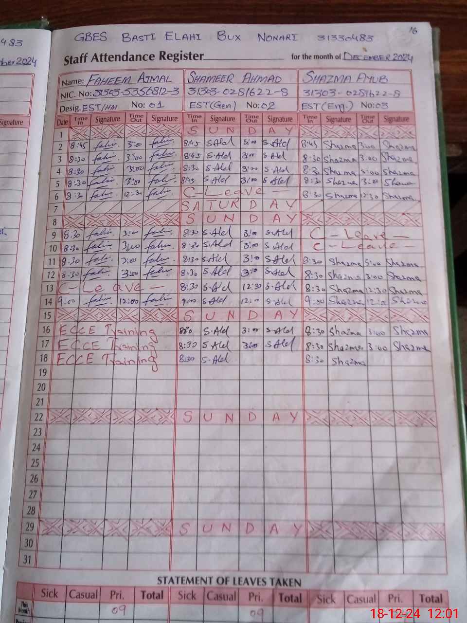 | CNIC | Full Name | Designation | R/C | Absence during last cal. month |