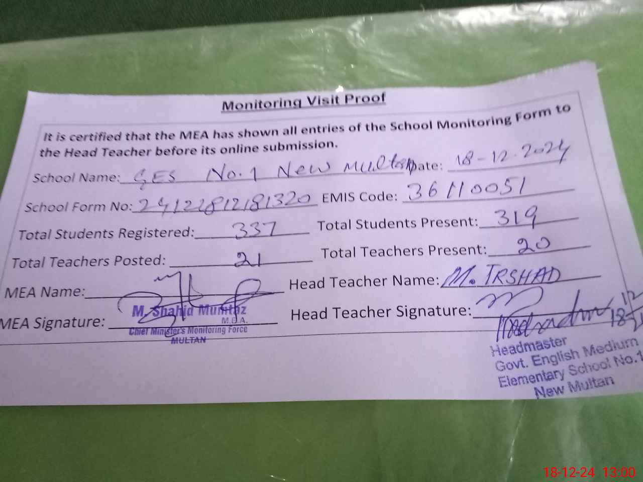 | EMIS Code: 36110051 | Name of School: GES NO 1 NEW MULTAN GULSHAN MARKET | |||
