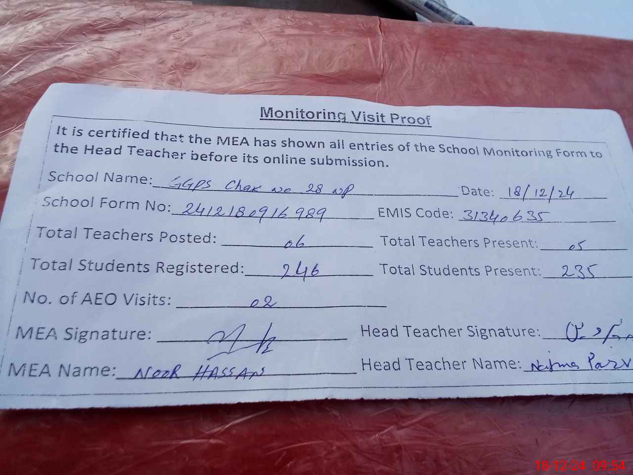 | Attendance Register | Head Teacher | MEA with School | Visit Proof |