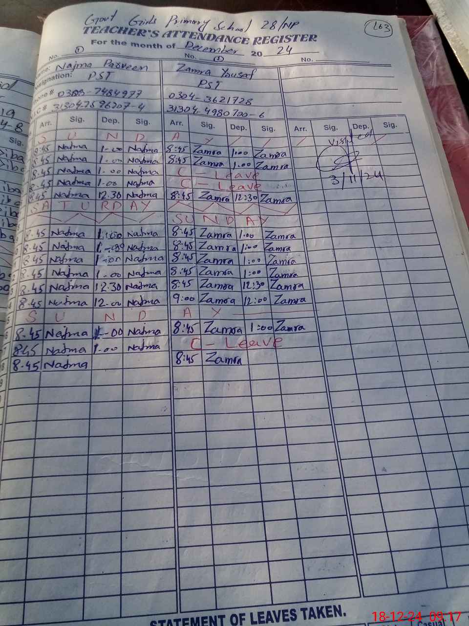 | 31**** | Gh**** Ar**** | PST | Regular | 3 | 0 | 0 | 0 | 0 | 0 | 0 | 0 | 3 | Maternity |
