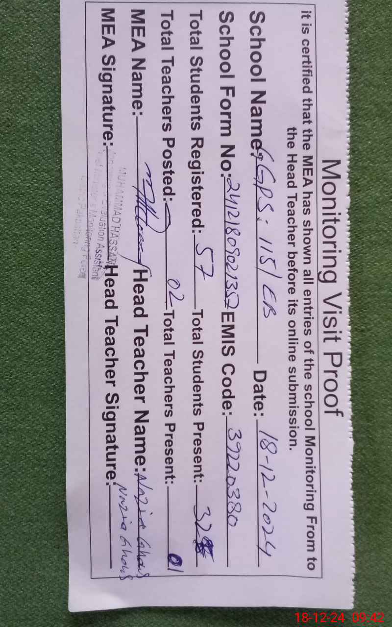 | EMIS Code: 39220380 | Name of School: GGPS 115 EB P/O THANA AHMAD YAR | |||