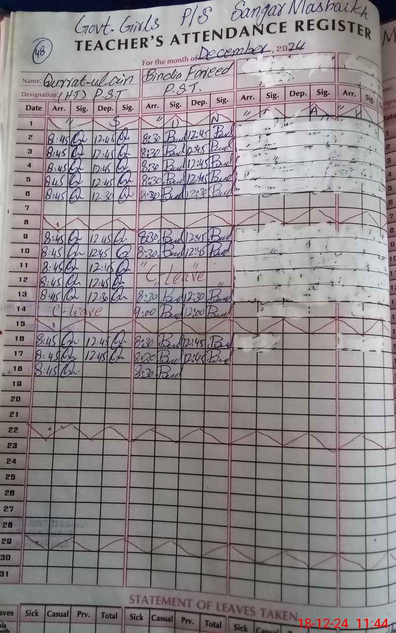 | CNIC | Full Name | Designation | R/C | Absence During Last Calender Month |