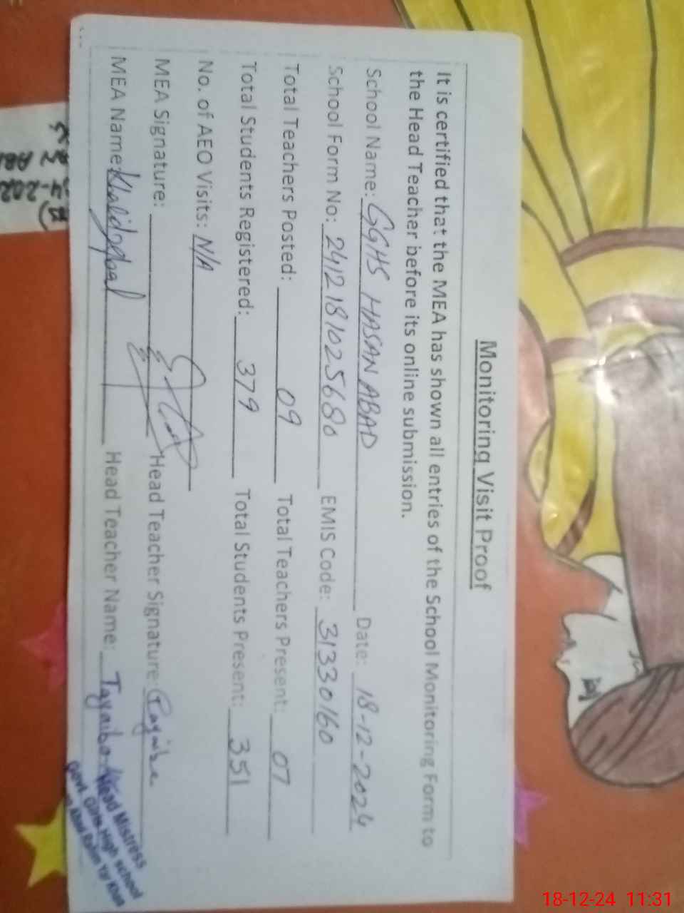| Attendance Register | Head Teacher | MEA with School | Visit Proof |