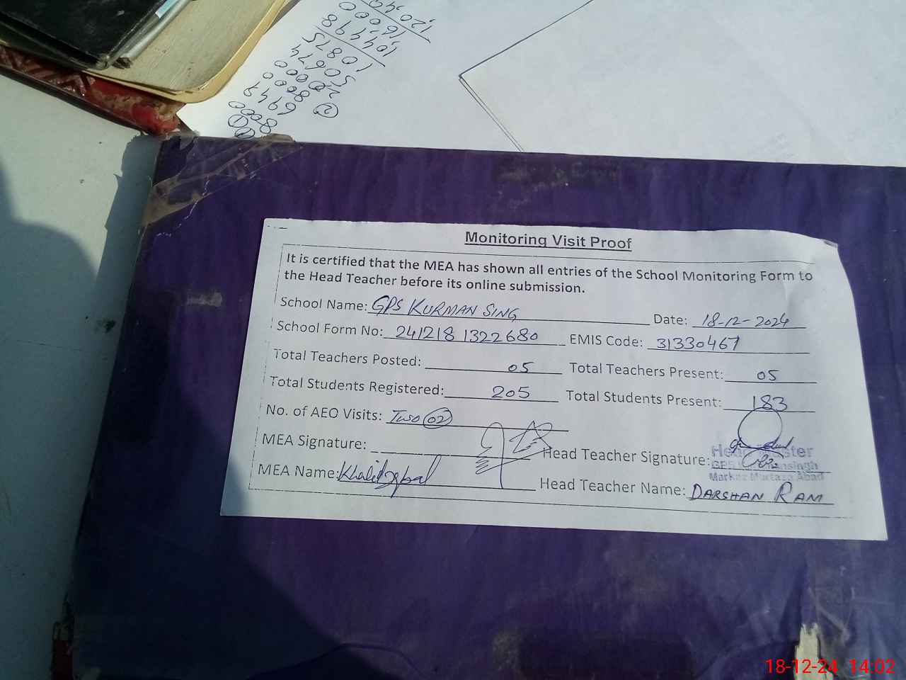 | Attendance Register | Head Teacher | MEA with School | Visit Proof |