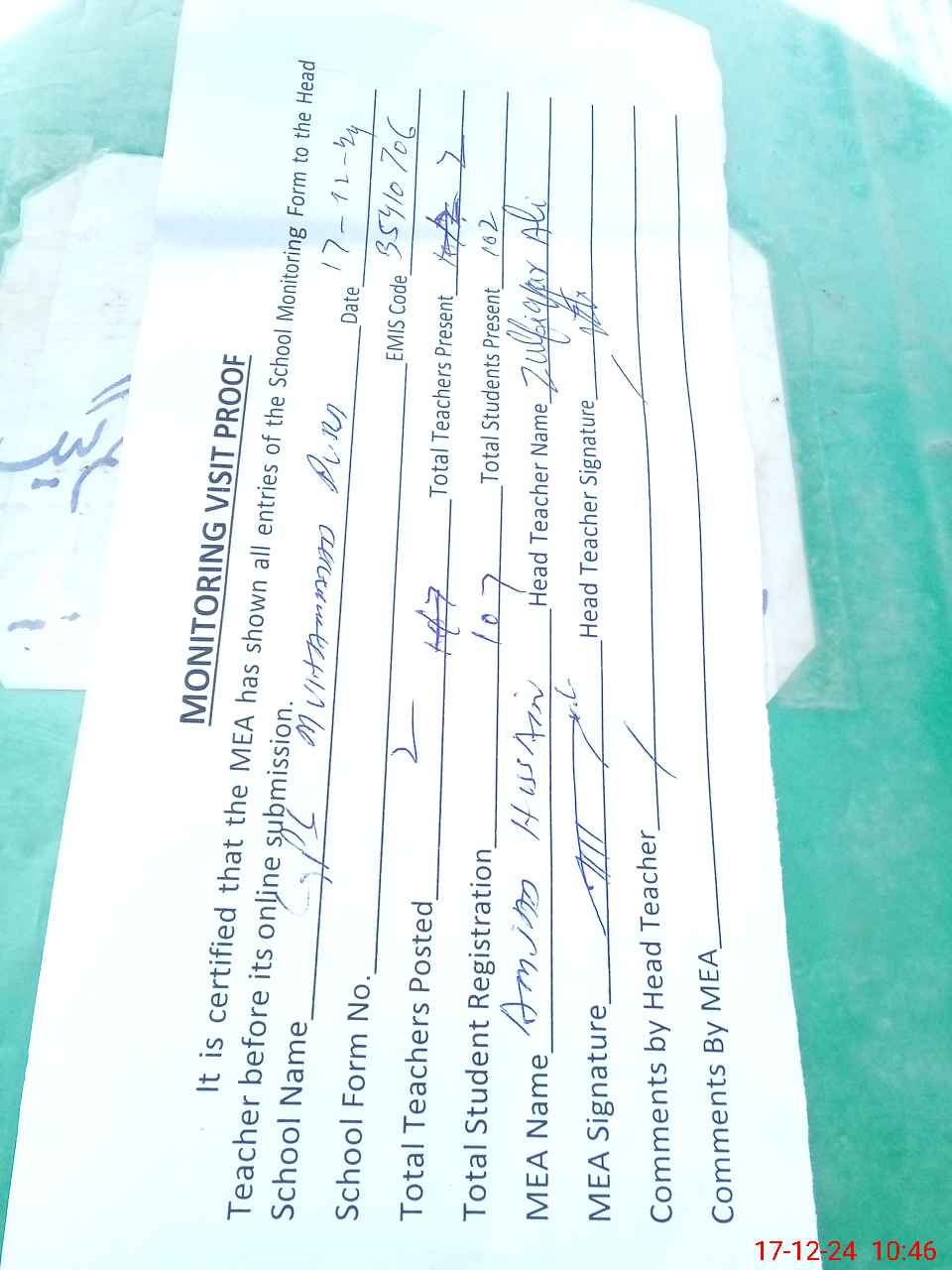 | Attendance Register | Head Teacher | MEA with School | Visit Proof |