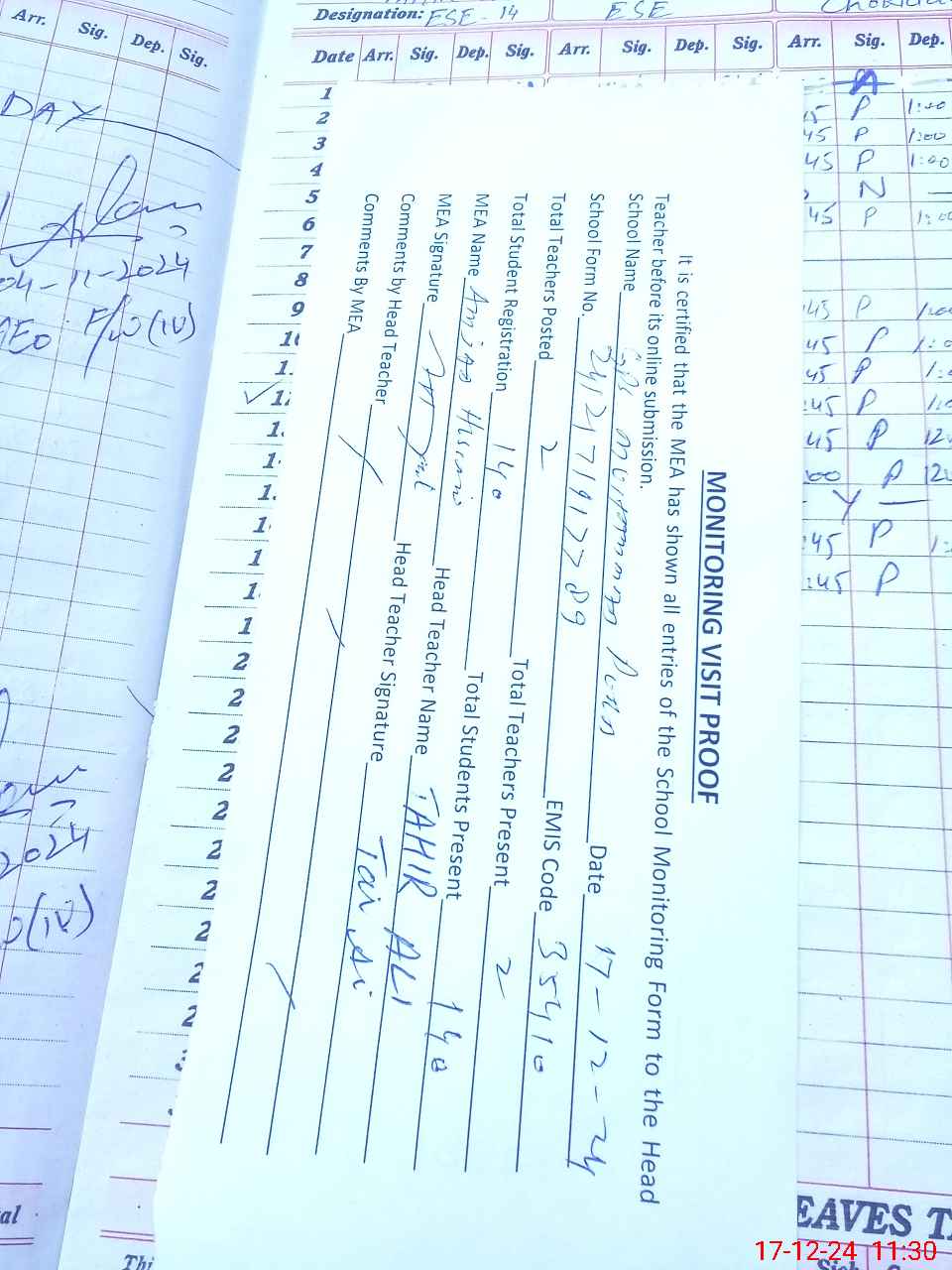 | Attendance Register | Head Teacher | MEA with School | Visit Proof |