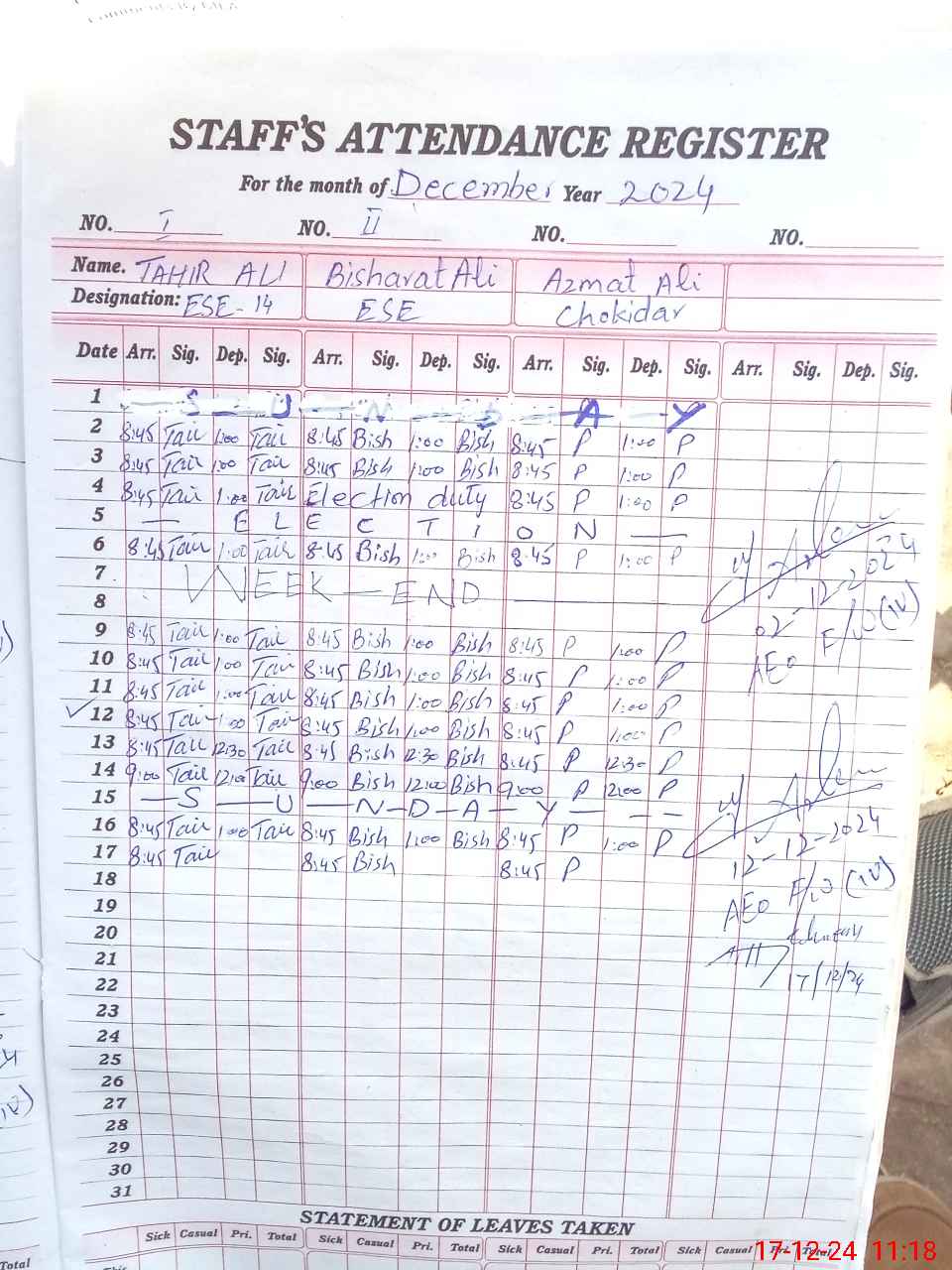 | CNIC | Full Name | Designation | R/C | Absence during last cal. month |