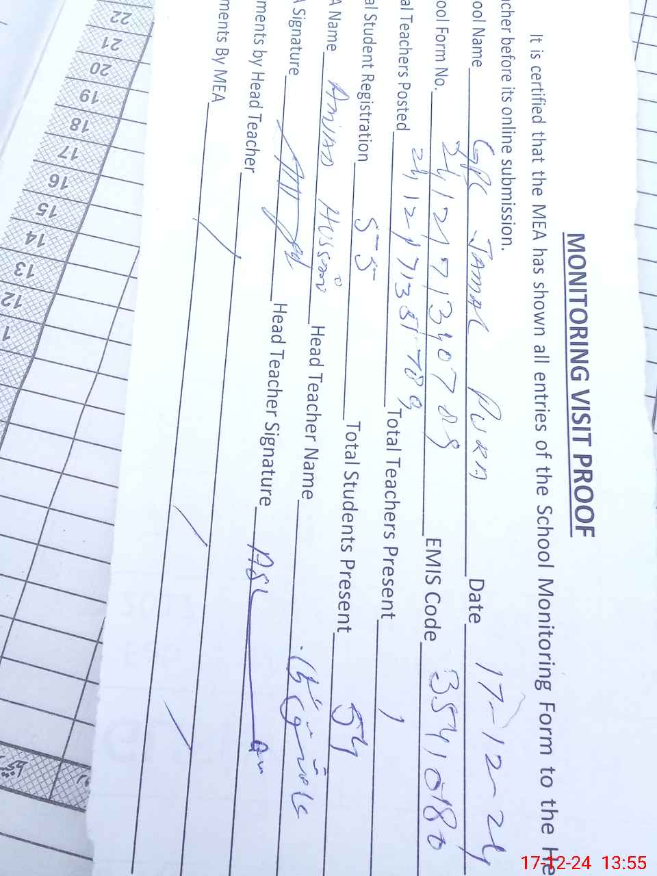 | Attendance Register | Head Teacher | MEA with School | Visit Proof |