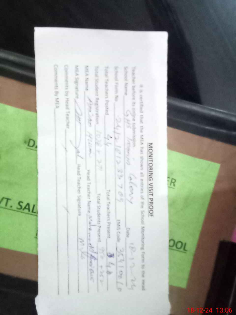 | Attendance Register | Head Teacher | MEA with School | Visit Proof |