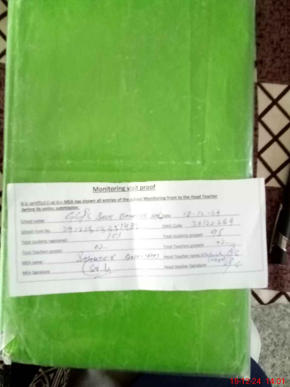 | Attendance Register | Head Teacher | MEA with School | Visit Proof |