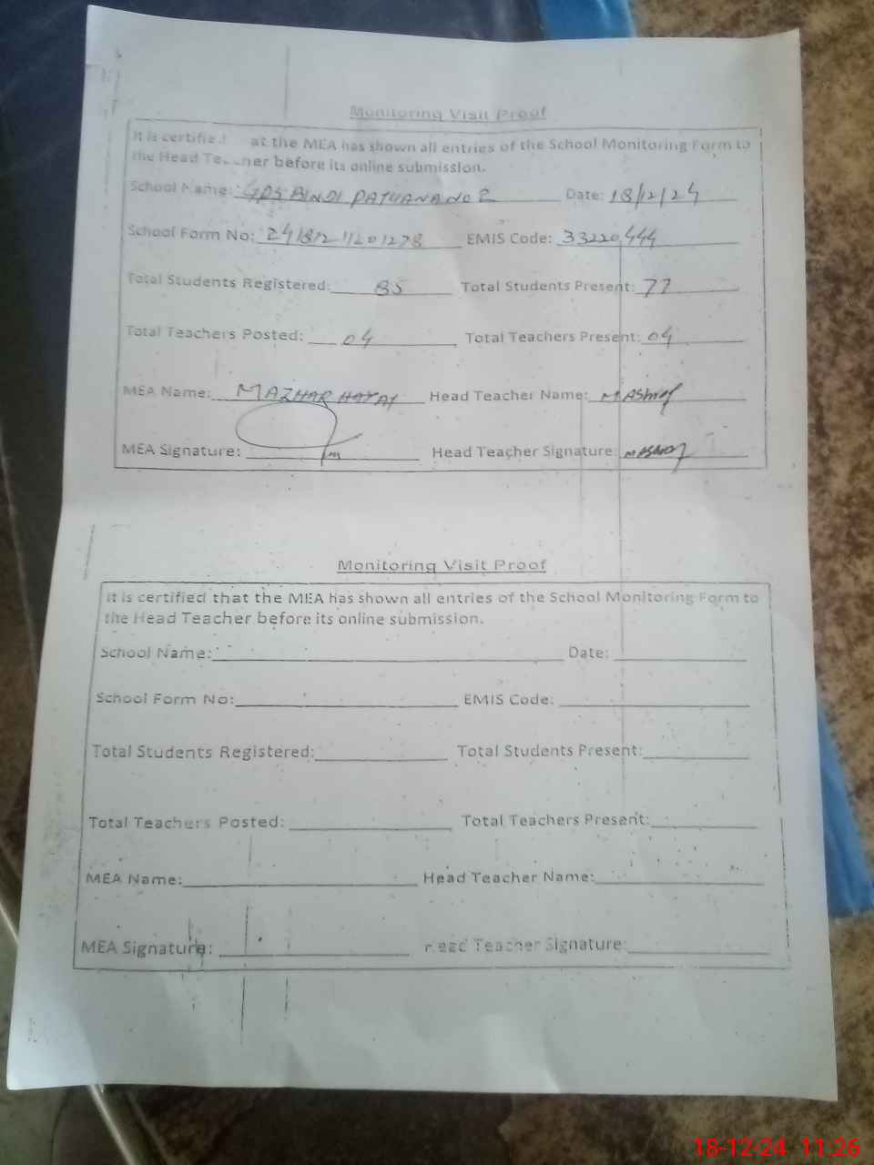 | Attendance Register | Head Teacher | MEA with School | Visit Proof |