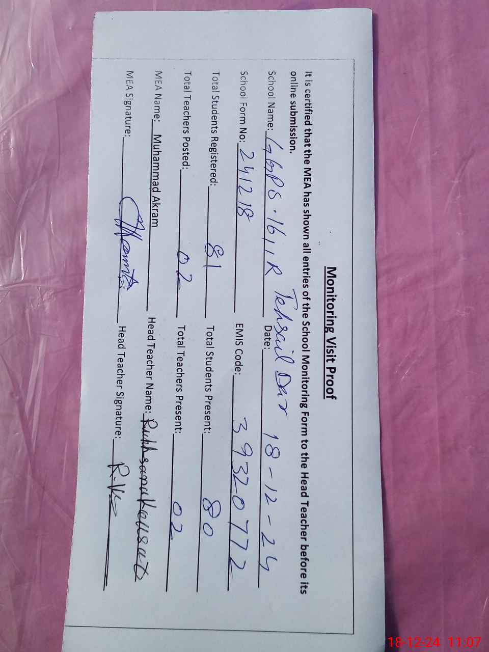 | EMIS Code: 39320772 | Name of School: GGPS CHAK NO. 16/1-R TEHSILDAR WALA | |||