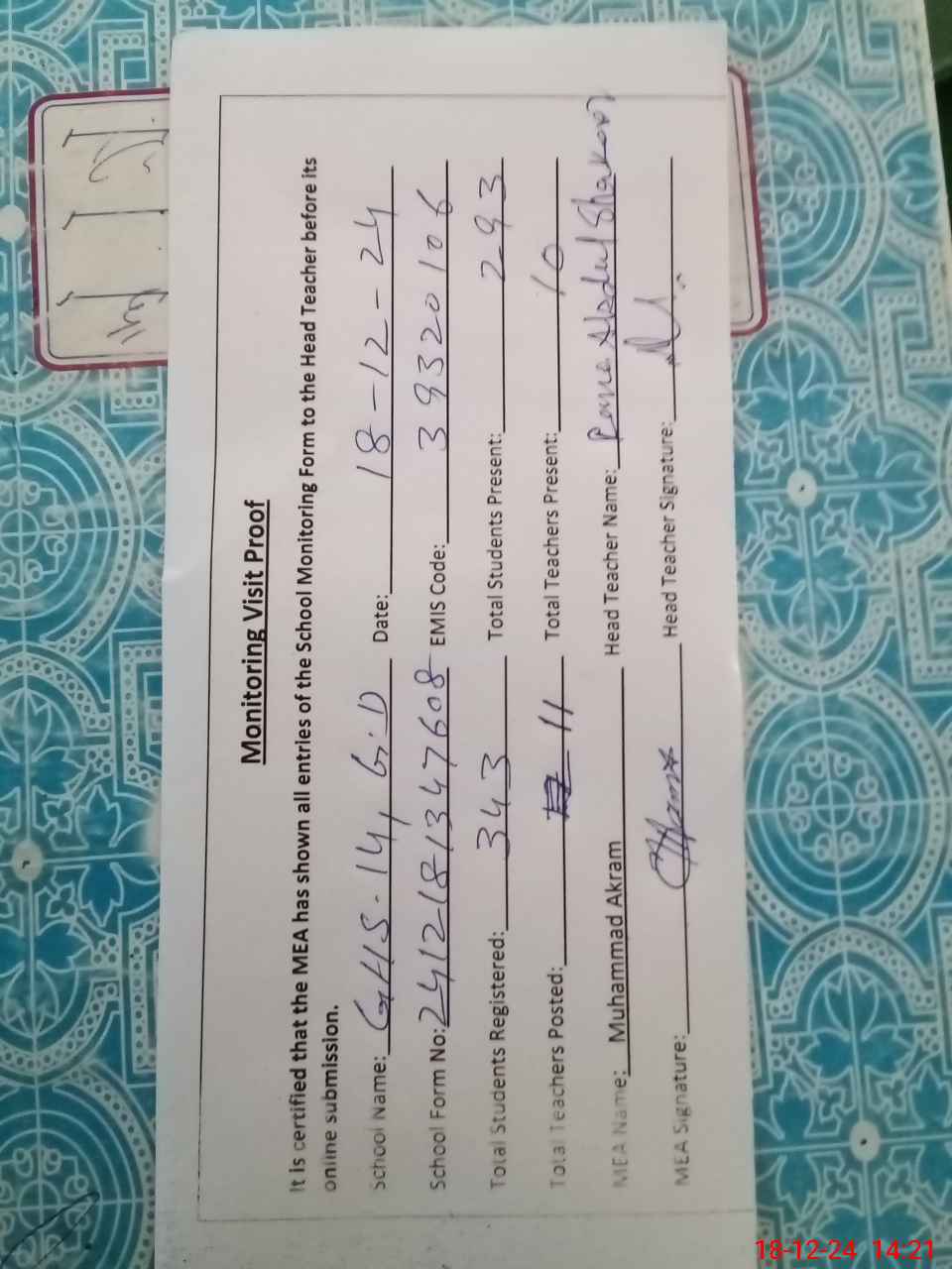 | EMIS Code: 39320106 | Name of School: GHS CHAK NO. 14/GD RAZA ABAD | |||