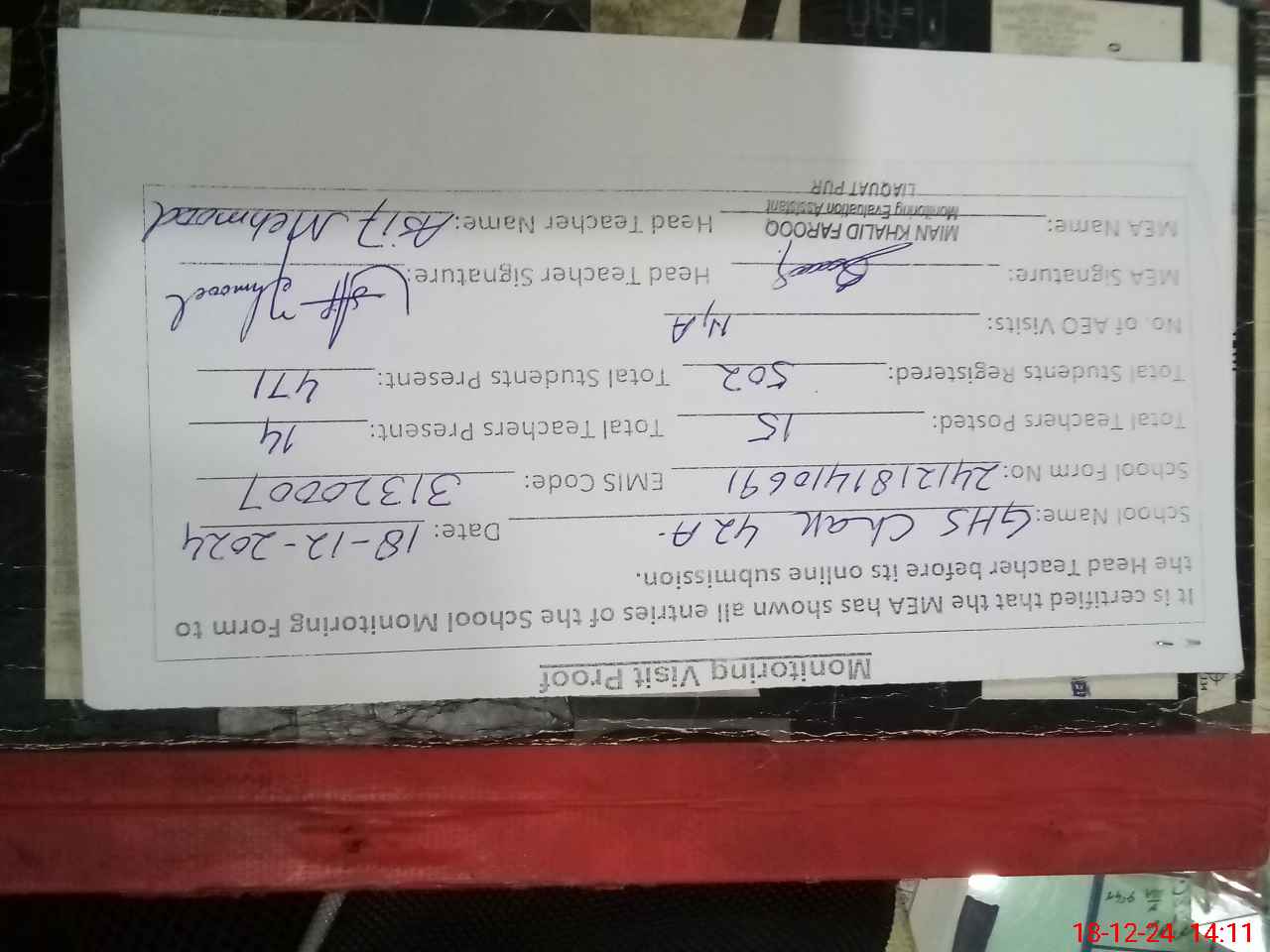 | Certified that this School was Inspected by the Undersigned MEA/DMO Today and the Information Stated Above is as Per Record. | |||||