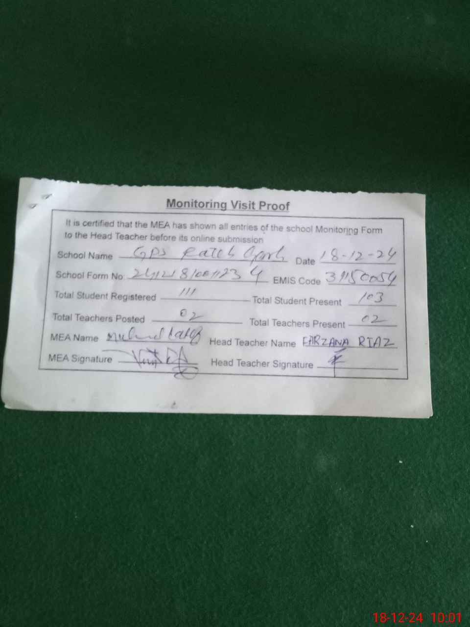 | Attendance Register | Head Teacher | MEA with School | Visit Proof |