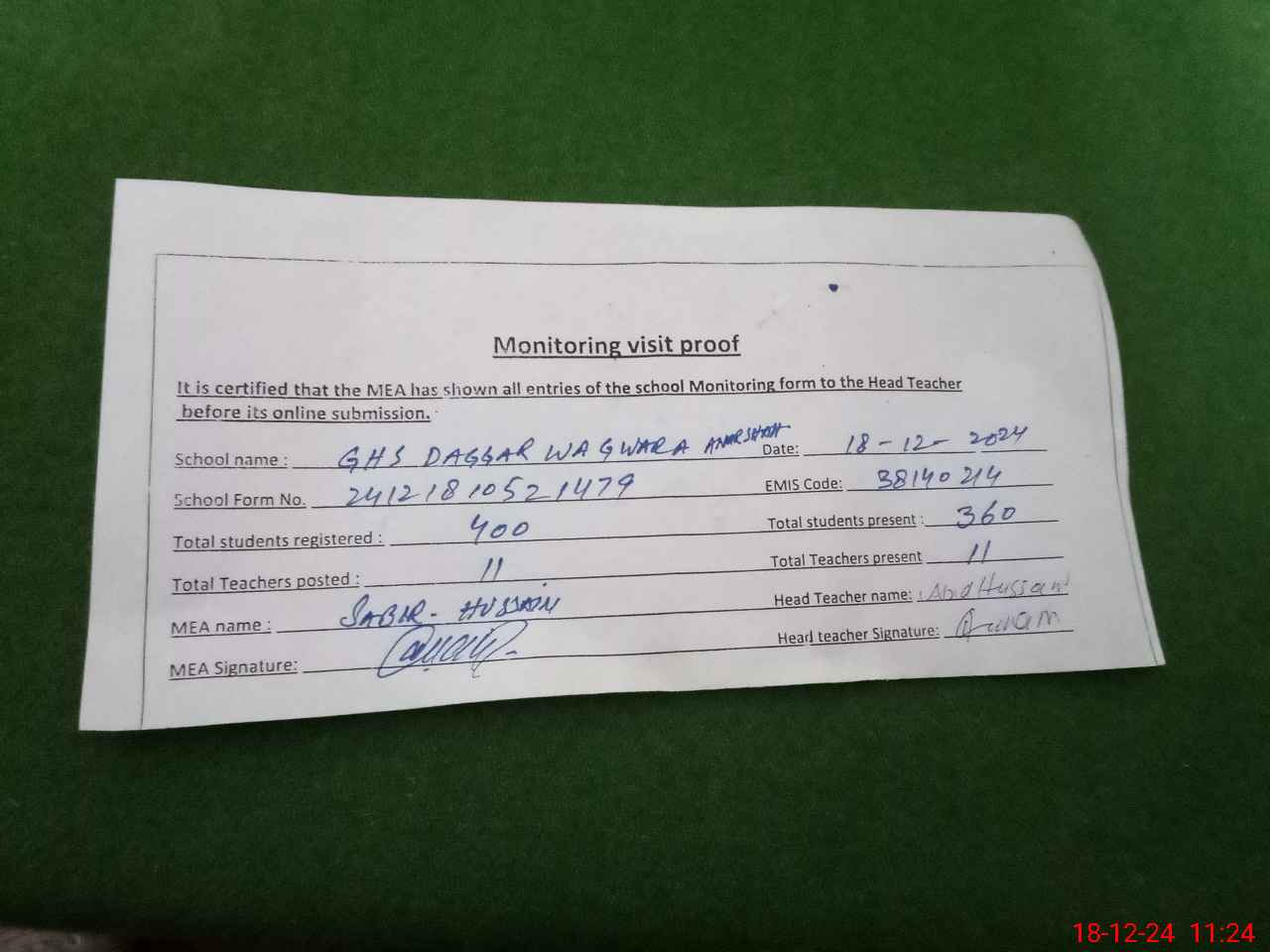 | Attendance Register | Head Teacher | MEA with School | Visit Proof |