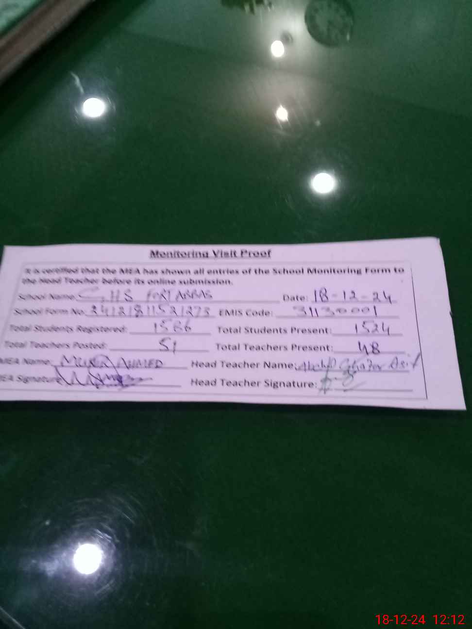 | Attendance Register | Head Teacher | MEA with School | Visit Proof |