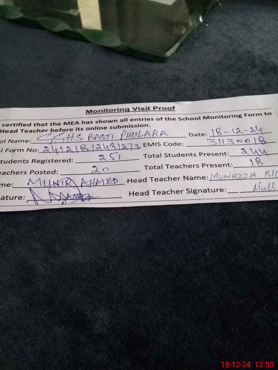 | Attendance Register | Head Teacher | MEA with School | Visit Proof |