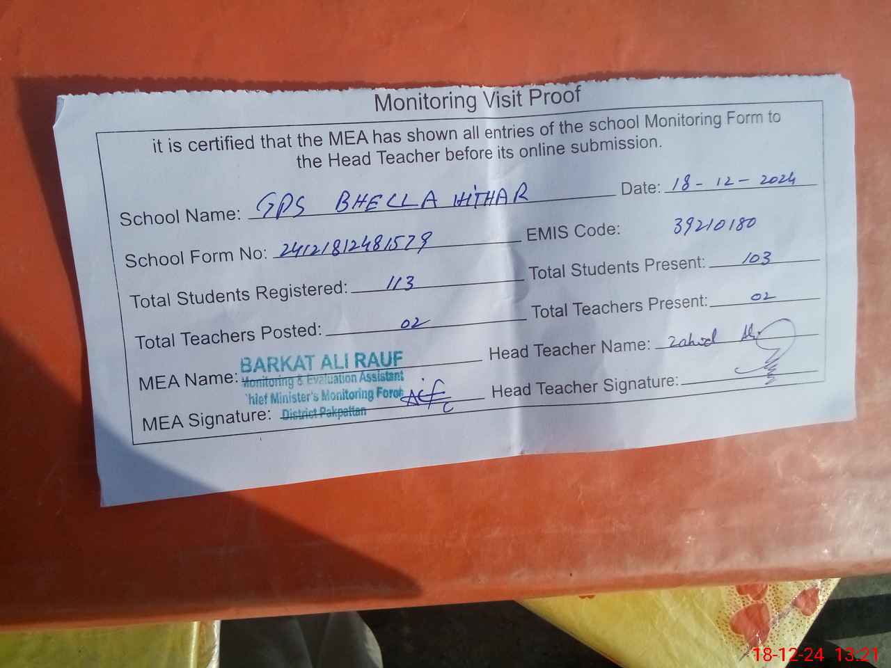 | Attendance Register | Head Teacher | MEA with School | Visit Proof |