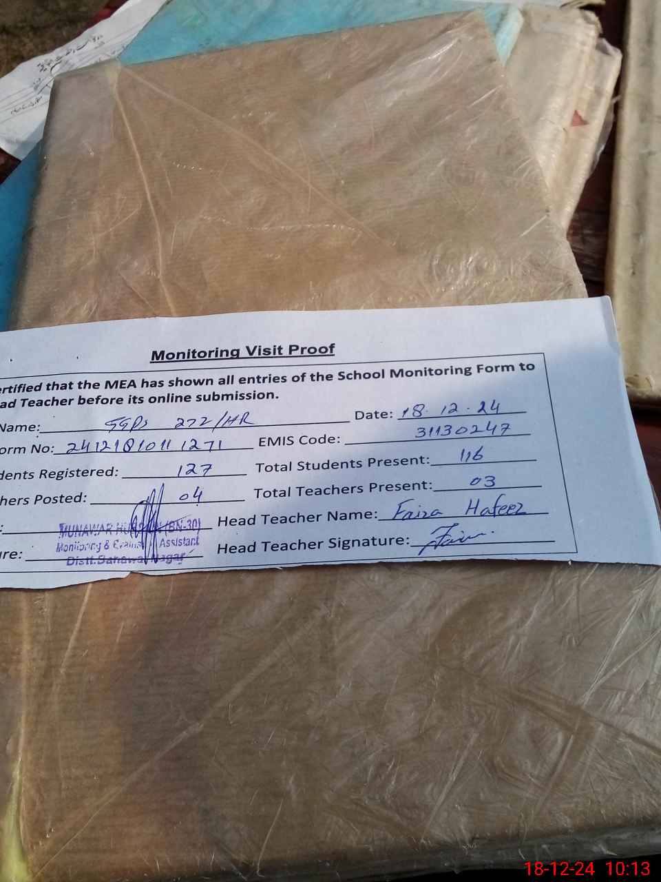 | Attendance Register | Head Teacher | MEA with School | Visit Proof |