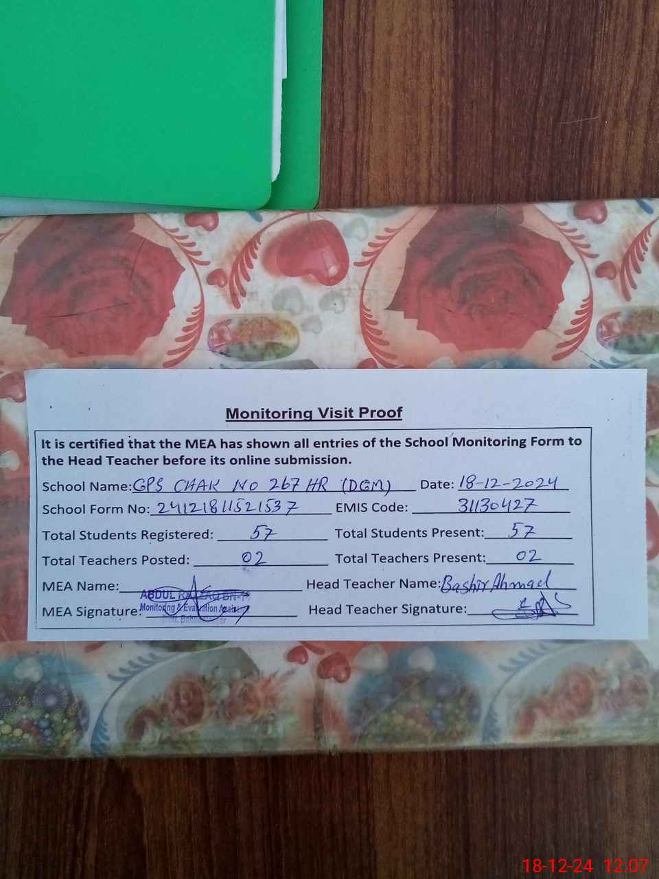 | Attendance Register | Head Teacher | MEA with School | Visit Proof |