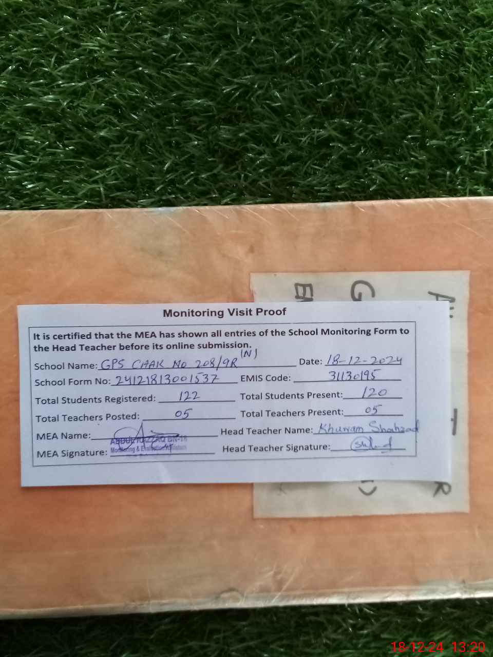 | Attendance Register | Head Teacher | MEA with School | Visit Proof |