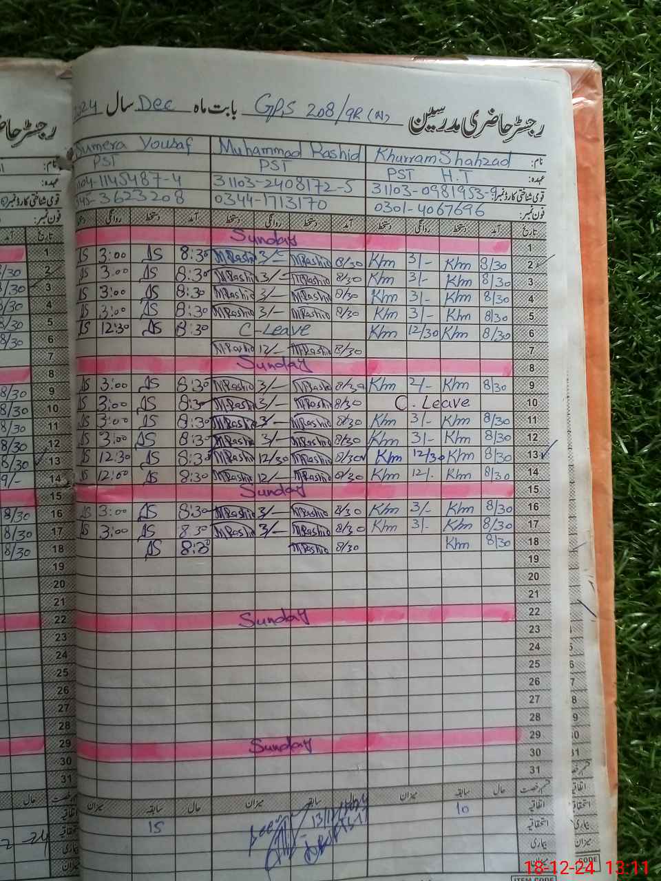 | CNIC | Full Name | Designation | R/C | Absence during last cal. month |