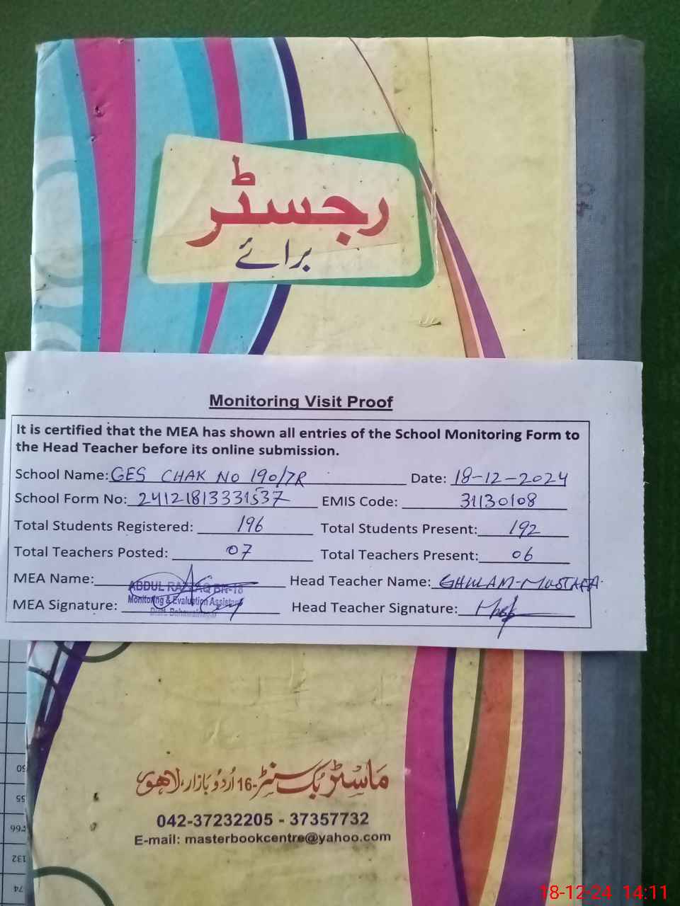 | EMIS Code: 31130108 | Name of School: GHS CHAK NO.190/7-R | |||