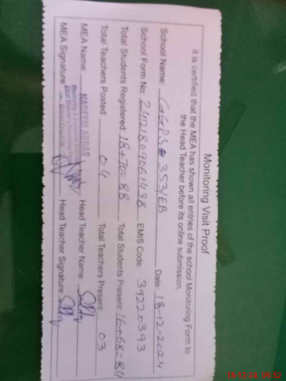 | Attendance Register | Head Teacher | MEA with School | Visit Proof |