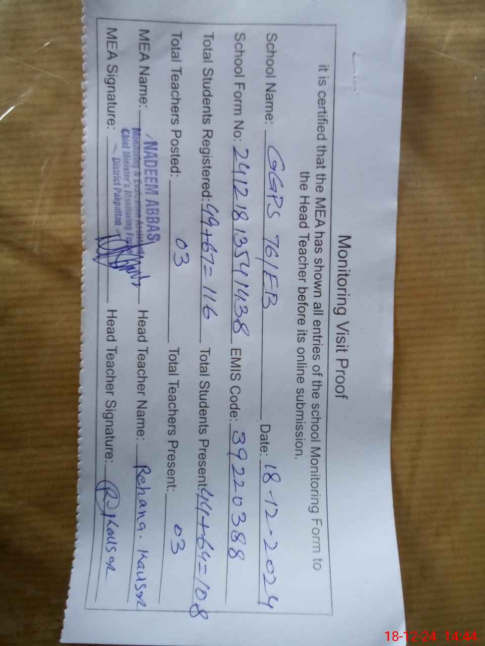 | EMIS Code: 39220388 | Name of School: GGPS 76 EB ARIFWALA | |||