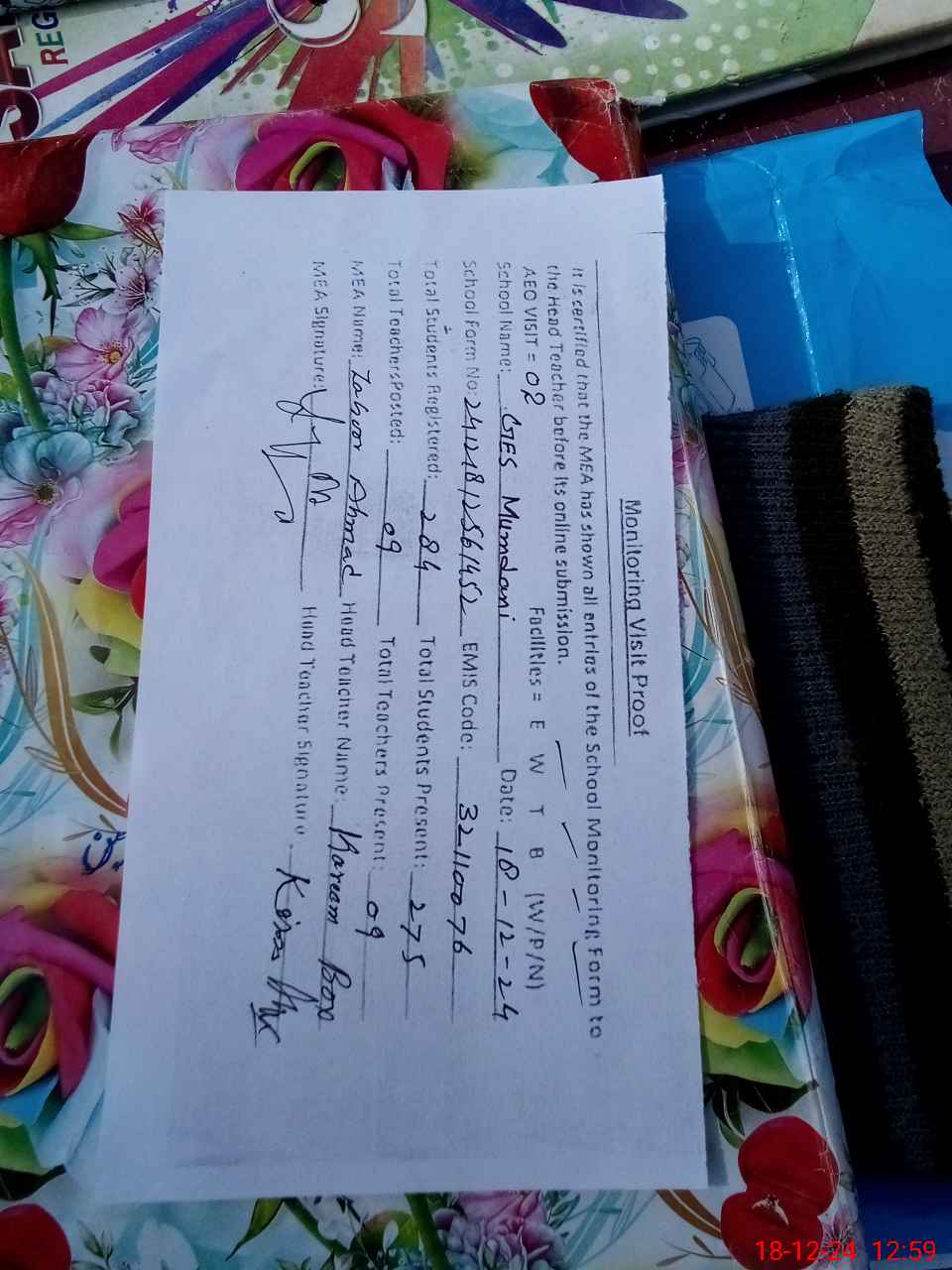 | Certified that this School was Inspected by the Undersigned MEA/DMO Today and the Information Stated Above is as Per Record. | |||||