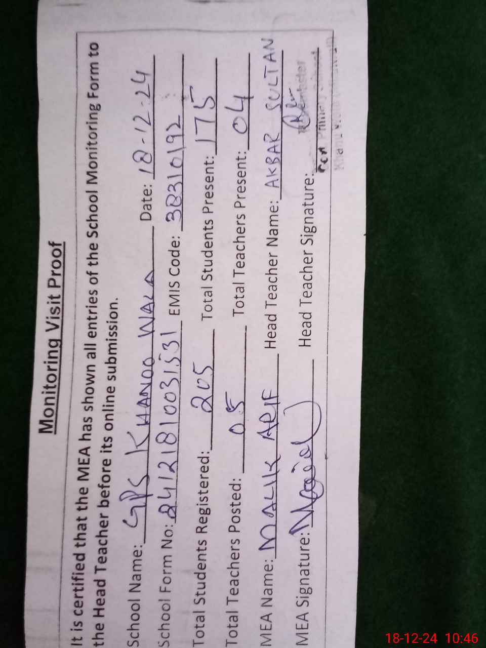 | Certified that this School was Inspected by the Undersigned MEA/DMO Today and the Information Stated Above is as Per Record. | |||||
